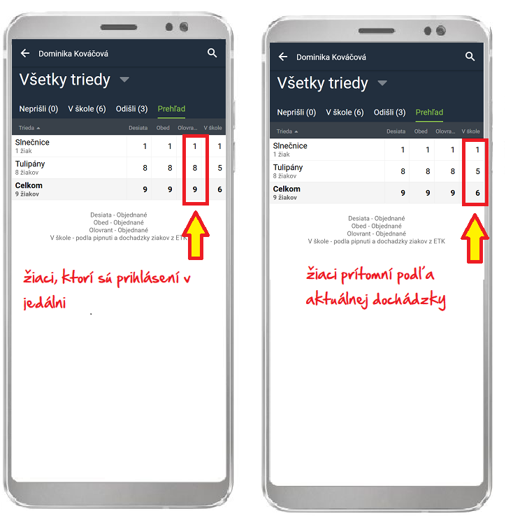 V “Prehľade” si môže učiteľ/vychovávateľ, ale napr. aj personál v kuchyni vybrať konkrétnu triedu alebo vidieť aktuálny počet žiakov v celej škole.
