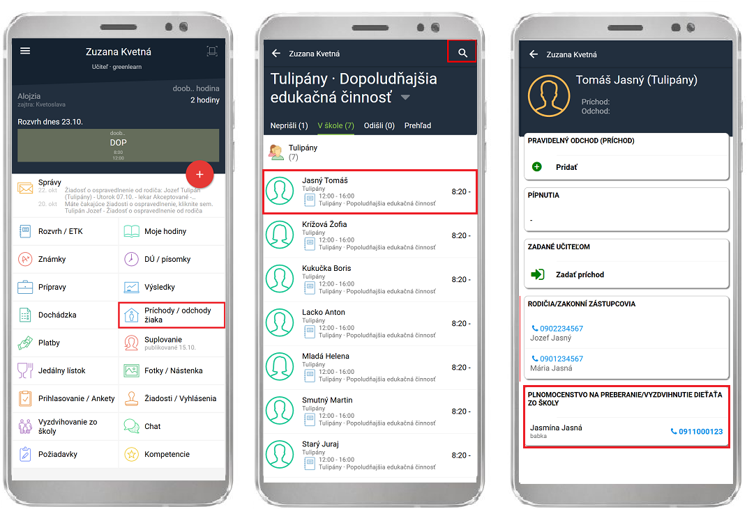 Na to, aby učiteľ v "Príchodoch/odchodoch žiaka" videl zoznam splnomocnených osôb je potrebné, aby rodič podal cez "Žiadosti/vyhlásenia" Plnomocenstvo na preberanie žiaka zo školy