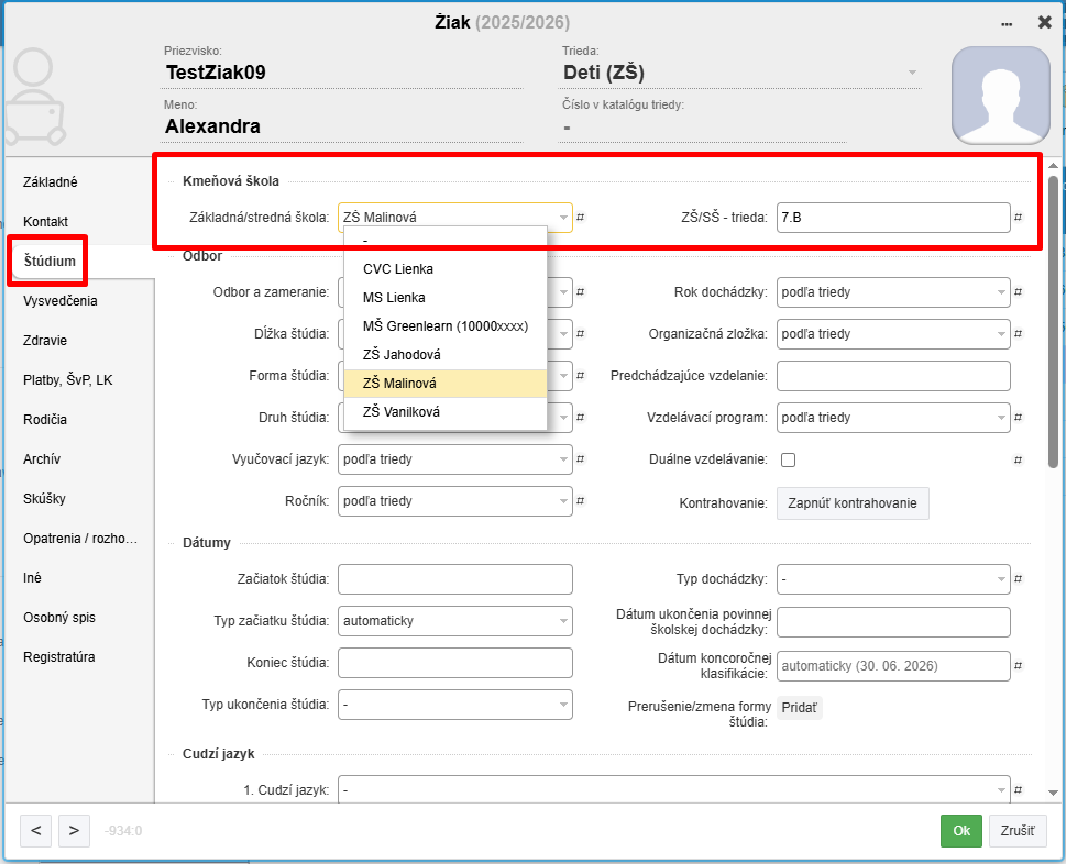 V jeho karte žiaka si vyberte časť Štúdium a sekciu Kmeňová škola (*).