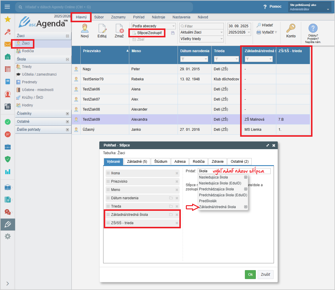 V pohľade Žiaci - Hlavný pridajte stĺpce: