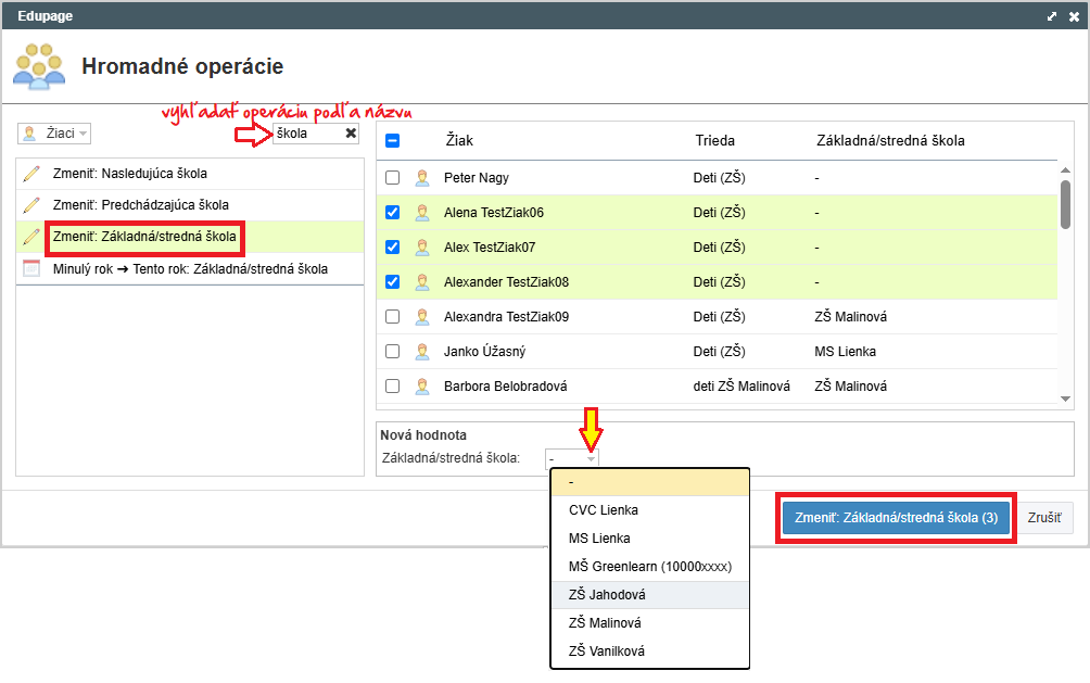 Ak chcete naraz viacerým žiakom nastaviť rovnakú hodnotu pre políčka Základná/stredná škola, ZŠ/SŠ - trieda, použite na to hromadnú operáciu: