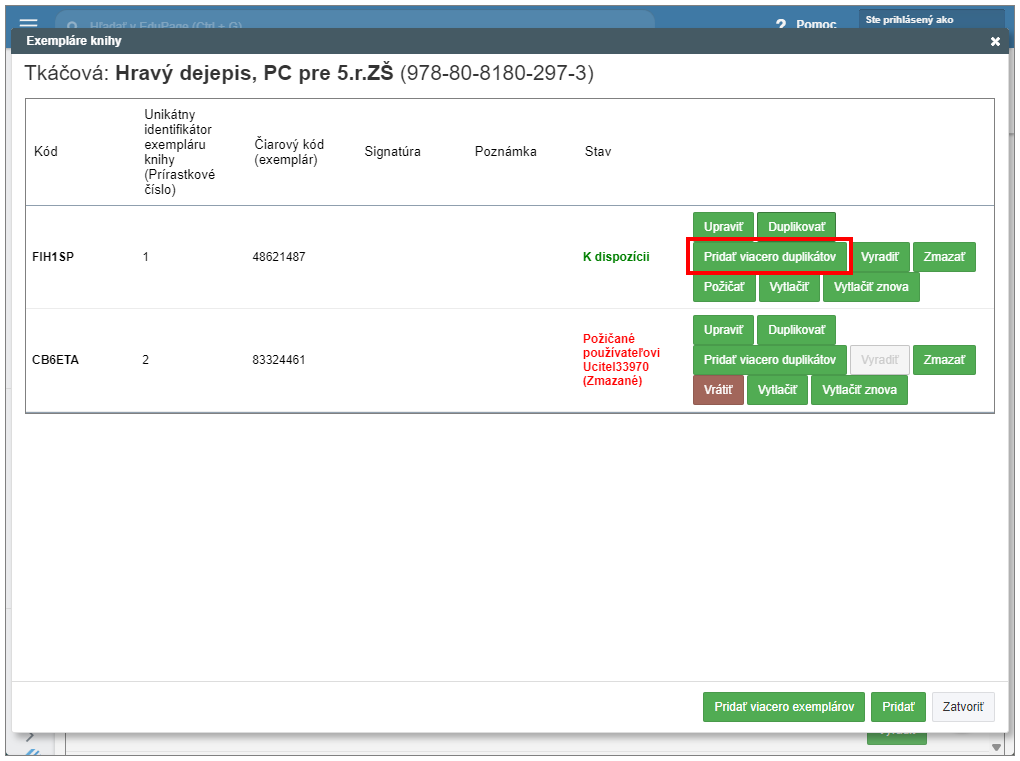Ak si želáte vytvoriť viac exemplárov učebníc s rovnakými údajmi ako má už existujúci exemplár, potom v riadku vybraného exempláru stlačte tlačidlo "Pridať viacero duplikátov".