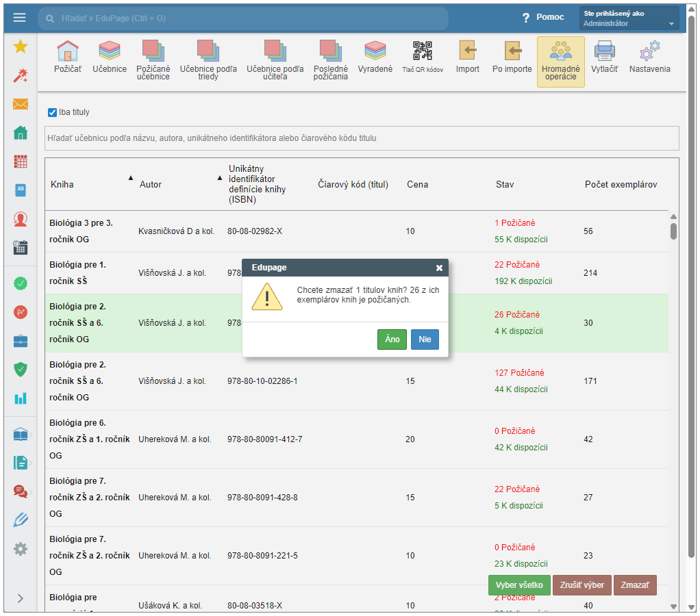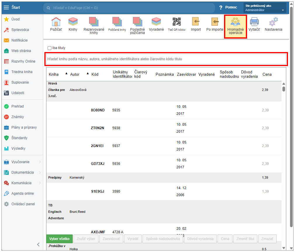 Hromadné operácie v module Knižnica / Sklad učebníc