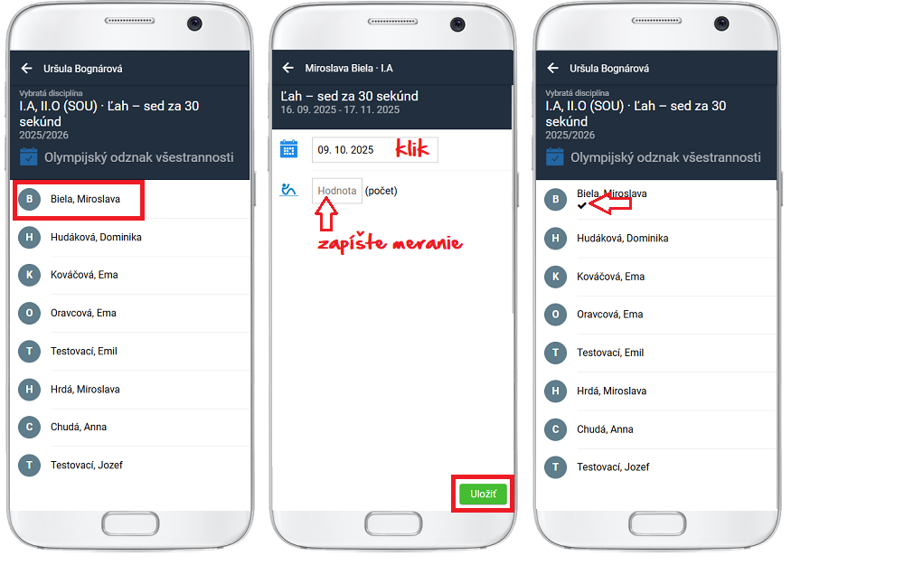 Zo zoznamu vyberte žiaka, pre ktorého idete zapísať meranie.