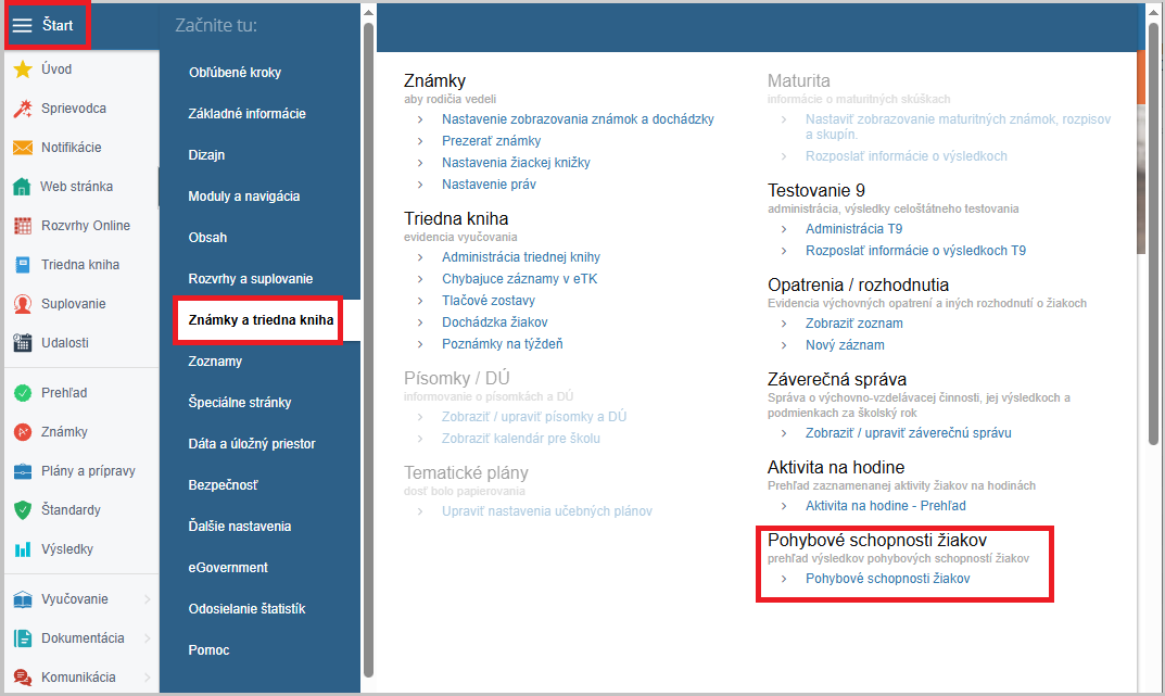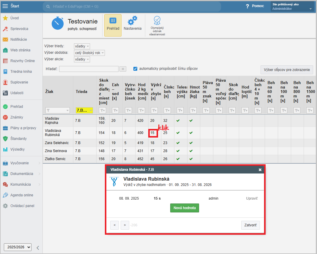 Administrátor EduPage a učiteľ s pridelením používateľským právom si modul Testovanie pohybových schopností otvorí na web stránke EduPage takto: