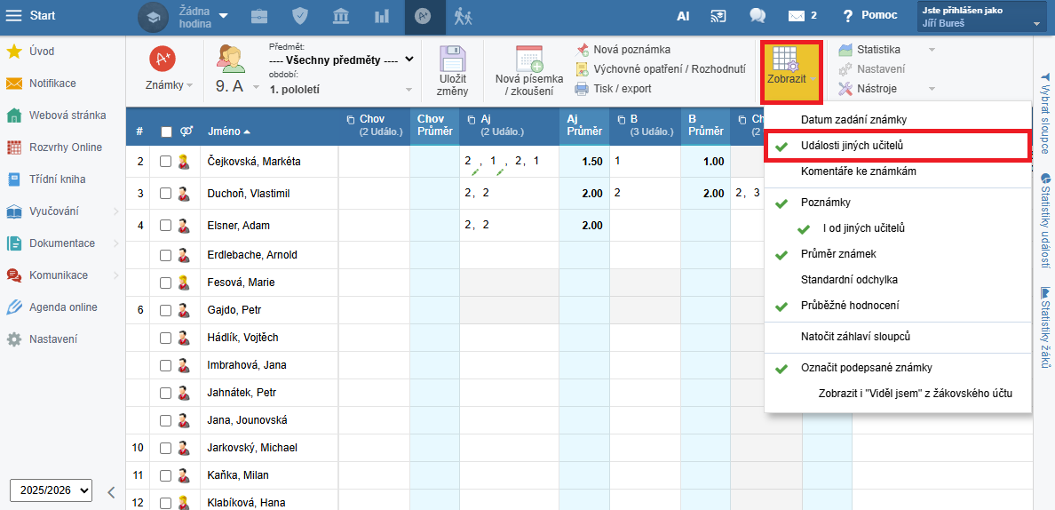 Pokud třídní učitel nevidí průběžné známky od jiných učitelů, je třeba zaškrtnout zobrazování událostí jiných učitelů.