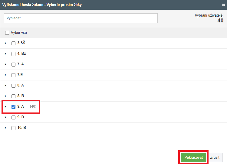 Vyberte třídu a žáky, kterým chcete hesla vytisknout. Stiskněte „Pokračovat“.