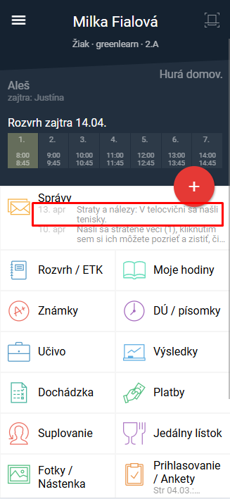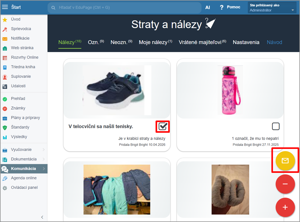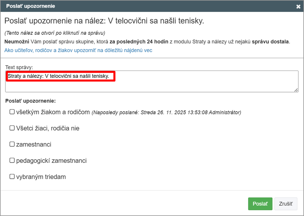 V texte správy bude informácia o konkrétnej nájdenej veci. Vyberte, komu chcete poslať notifikáciu. Rodičom a učiteľom je možné poslať notifikáciu až po 24 hodinách od posledného upozornenia, žiakom neobmedzene.