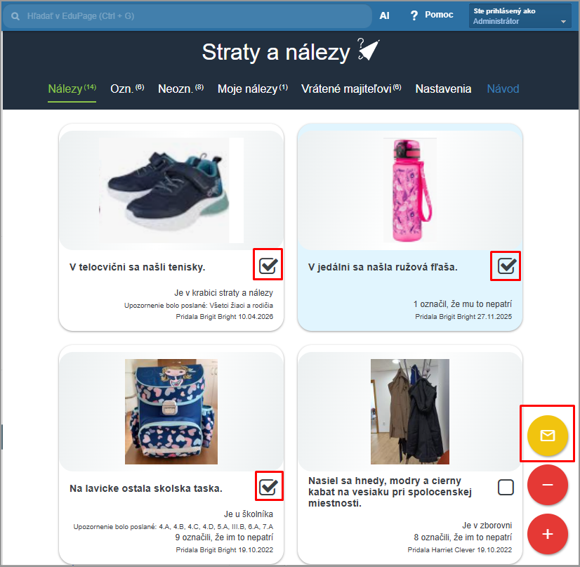 V texte správy sa Vám zobrazia informácie o nájdených veciach, ktoré ste označili. Vyberte skupinu adresátov, ktorým chcete poslať upozornenie. Rodičom a učiteľom je možné poslať notifikáciu raz za 24 hodín, žiakom aj viackrát denne.