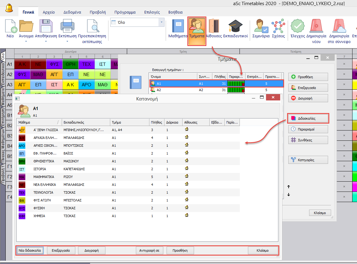 Καθώς η προσθήκη διδασκαλιών για τα τμήματα είναι στην ουσία η ίδια διαδικασία για την προσθήκη διδασκαλιών στους εκπαιδευτικούς, θα περιγράψουμε και τις δύο μεθόδους στο άρθρο εισαγωγής διδασκαλιών στους εκπαιδευτικούς:Κατανομή