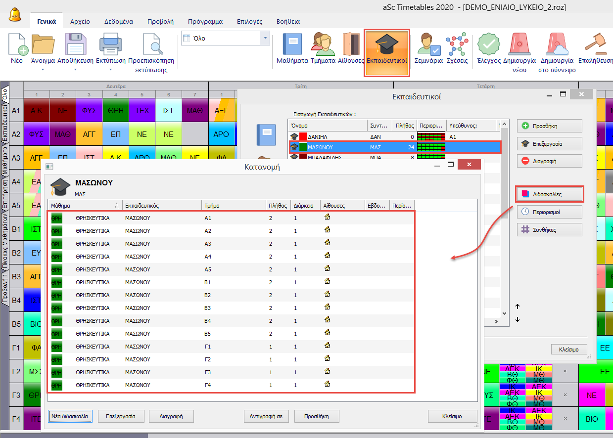 Κάντε διπλό-κλικ σε κάποια γραμμή για να επεξεργαστείτε τις ιδιότητες της διδασκαλίας.