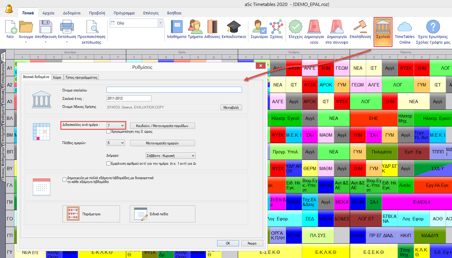 Σημείωση: Εδώ καθορίζετε το μέγιστο αριθμό περιόδων διδασκαλίας για το εκπαιδευτήριό σας.