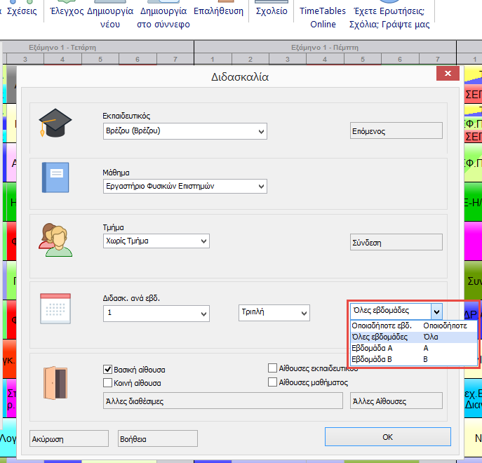 Μετά για κάθε διδασκαλία μπορείτε να ορίσετε ποια εβδομάδα θα υλοποιείται. Η προεπιλογή είναι να υλοποιούνται όλες τις εβδομάδες. Αυτό σημαίνει ότι θα είναι στην ίδια θέση και τις δύο εβδομάδες. Εάν το αλλάξετε αυτό, ας πούμε στην επιλογή “Οποιαδήποτε Εβδομάδα” το πρόγραμμα θα επιτρέψει να τοποθετηθεί η διδασκαλία είτε στην Εβδομάδα 1 είτε στην Εβδομάδα 2.