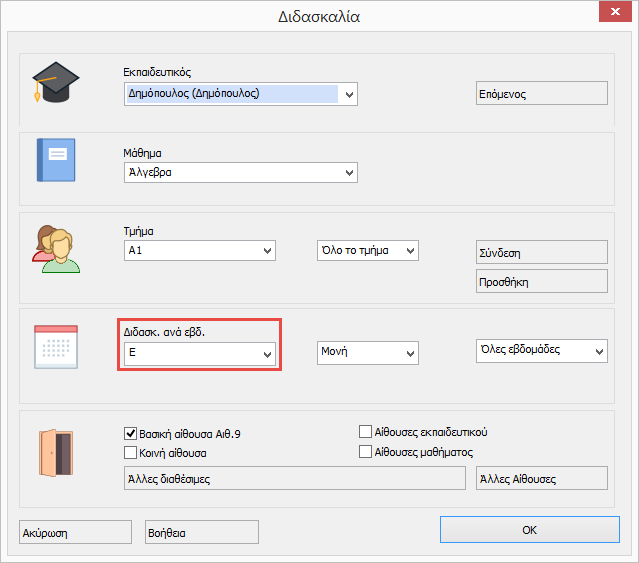Εάν θέλετε να ορίσετε η διδασκαλία να είναι στην ίδια θέση κάθε μέρα, μπορείτε απλά να επιλέξετε το “Ε” (Κάθε Μέρα) και αυτό το μάθημα θα είναι 5 φορές την εβδομάδα, στην ίδια περίοδο κάθε μέρα.