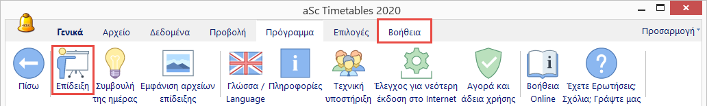 Η "Επίδειξη" μπορεί να ανοίξει, είτε από την αρχική οθόνη πριν δημιουργηθεί πρόγραμμα, είτε από το μενού Βοήθεια/Επίδειξη: