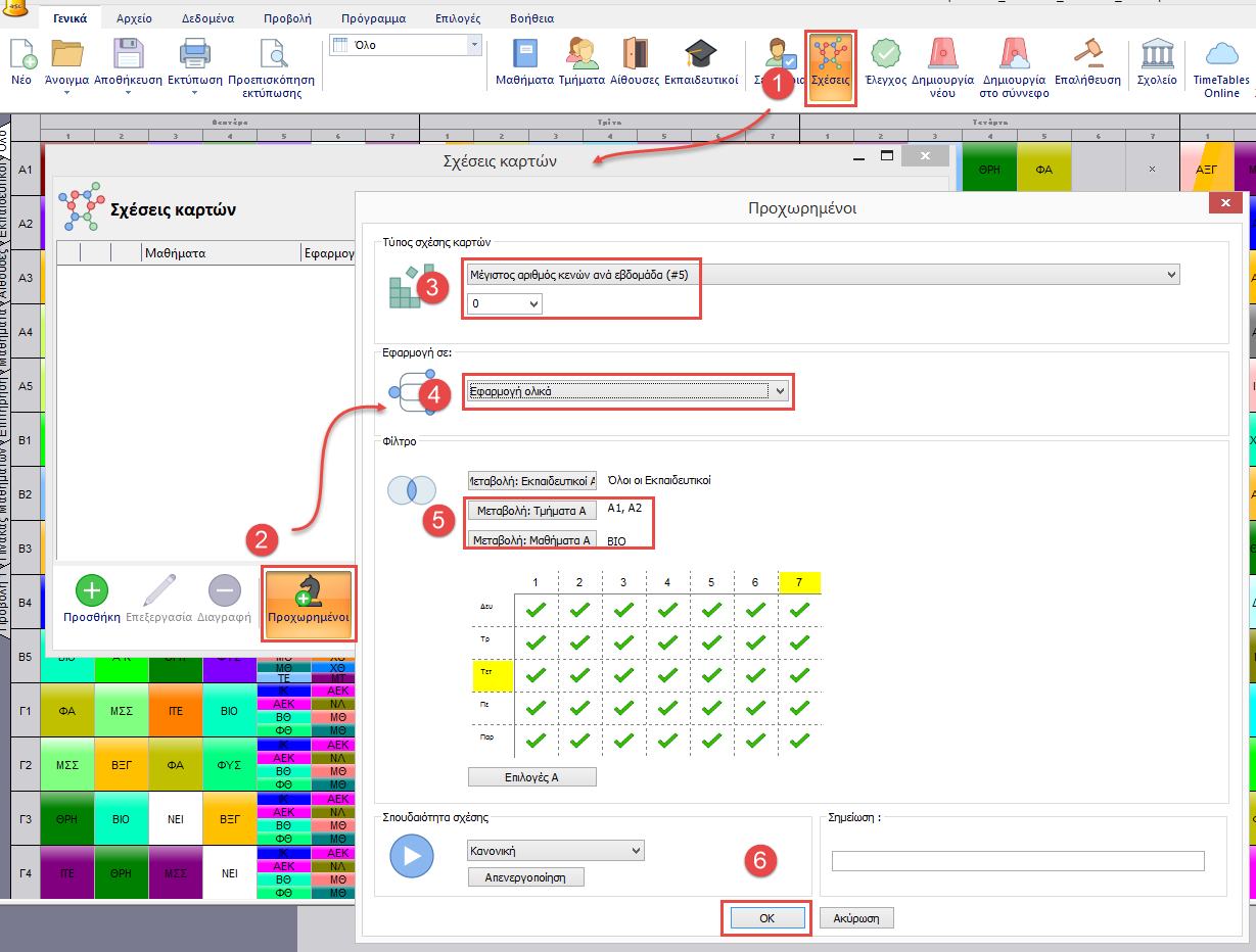 Παρόλα αυτά ο παραπάνω κανόνας θα θεωρήσει σαν κενό τον μόνο τον ελεύθερο χώρο μεταξύ δύο διδασκαλιών μέσα στην μέρα. Άρα αν η Βιολογία είναι σε διαφορετική μέρα στο τμήμα Α και στο Β το πρόγραμμα δεν θα το θεωρήσει σαν κενό. Άρα πρέπει να προσθέσετε μία δεύτερη σχέση που θα αναγκάσει τις διδασκαλίες να είναι τις ίδιες μέρες.
