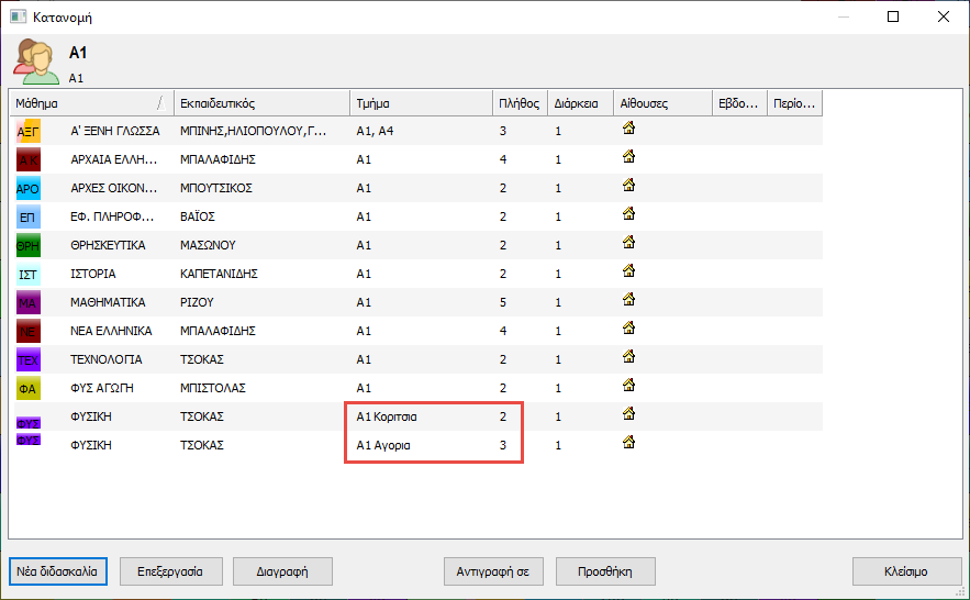 Παρακαλούμε σημειώστε ότι το πρόγραμμα μπορεί να τοποθετήσει διδασκαλίες ταυτόχρονα μόνο στην περίπτωση που προέρχονται από την ίδια κατηγορία σε ένα τμήμα.