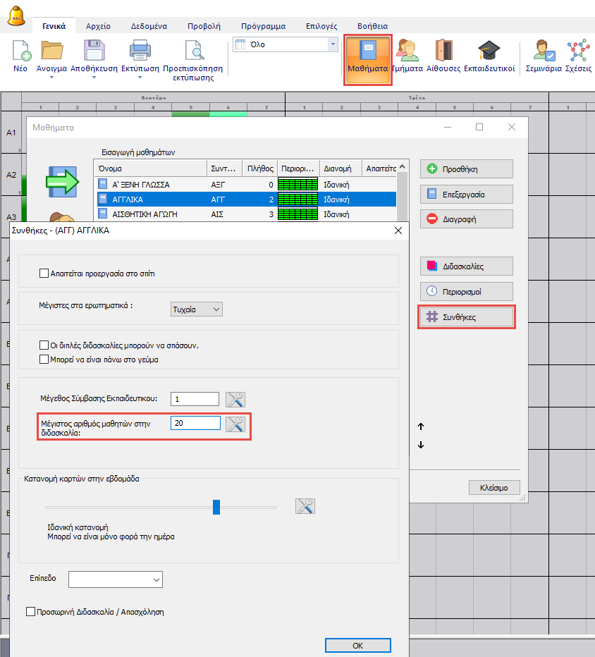 Μπορείτε επίσης να το ορίσετε και για όλες τις διδασκαλίες κάποιου μαθήματος, μέσα από τις "Συνθήκες" του μαθήματος και στο πεδίο "Μέγιστος αριθμός μαθητών στην διδασκαλία":