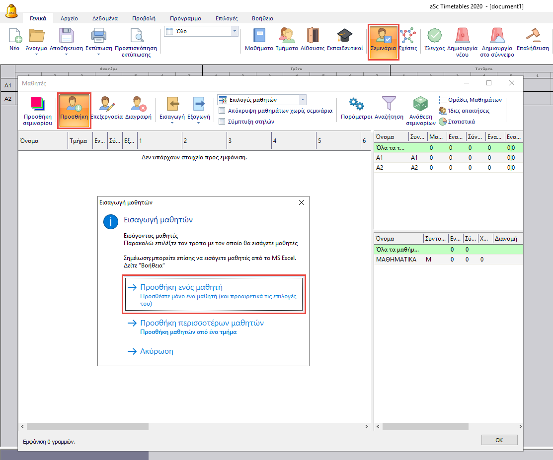 Στην συνέχεια από την επιλογή των σεμιναρίων κάντε κλικ στην εισαγωγή μαθητών. Έχετε δυνατότητα να προσθέσετε έναν μαθητή ή περισσότερους με μία κίνηση: