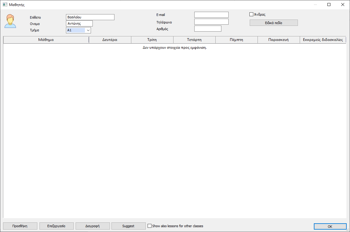 Με την προσθήκη ενός μαθητή μπορείτε να δηλώσετε επίσης και τα μαθήματα που έχει επιλέξει: