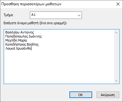 Ωστόσο, όπως θα δούμε αργότερα, το να καταχωρήσετε τις επιλογές μαθημάτων του κάθε μαθητή μπορεί να γίνει και για περισσότερους μαθητές ταυτόχρονα. Έτσι θα ήταν καλύτερα σαν πρώτο βήμα να καταχωρήσετε μόνο το όνομα και το τμήμα του κάθε μαθητή. Αυτό μπορεί επίσης να γίνει από τη δεύτερη επιλογή εισαγωγής μαθητών, ώστε να προσθέσετε περισσότερους μαθητές ταυτόχρονα: