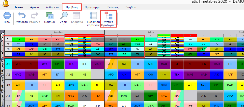 Μπορείτε να ενεργοποιήσετε την λειτουργία “Σχετικά Ωρολόγια” στο μενού Προβολή/Σχετικά Ωρολόγια. Μπορείτε να χρησιμοποιήσετε και τη συντόμευση CTRL-R.